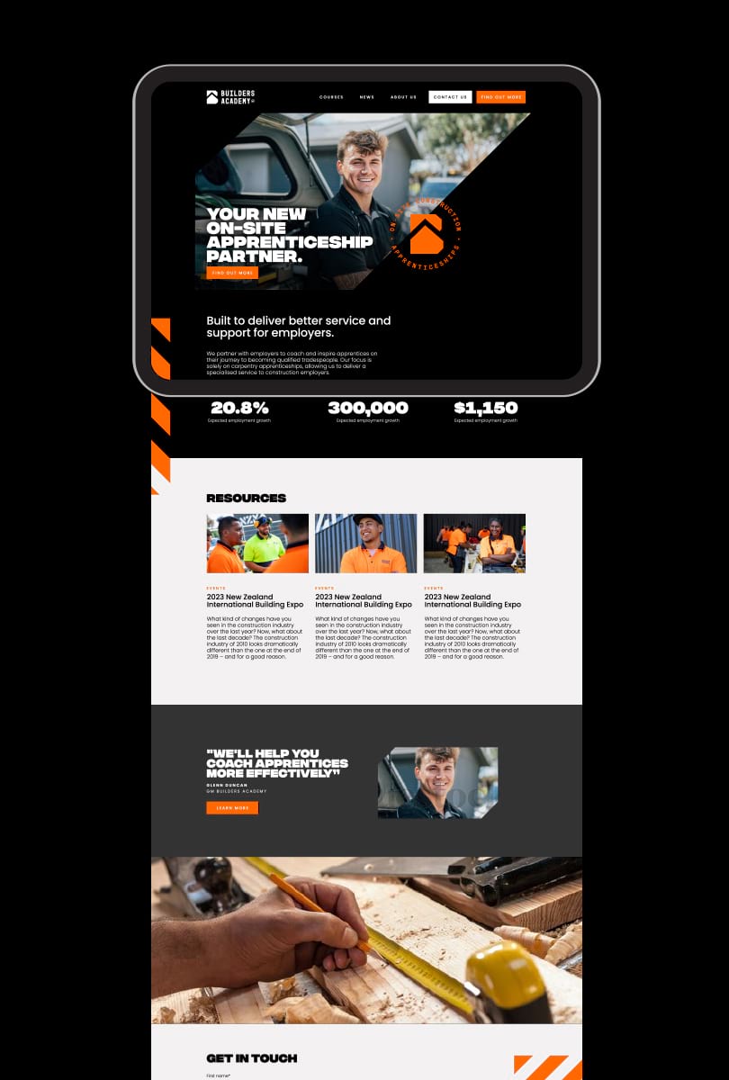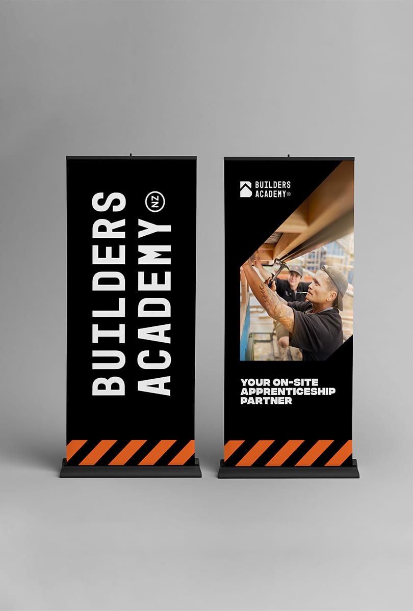 We helped Builders Academy apply this simple and versatile brand system to a number of outputs including business cards, brochures, vehicle livery, uniforms, website & social media. Since launching the brand, the team have had a very positive response from clients and people in the construction industry. Within a year of launching - Builders Academy train 800+ carpentry apprentices a year, have hired over 50 Workplace Apprenticeship Educators and have expanded to the South Island.
