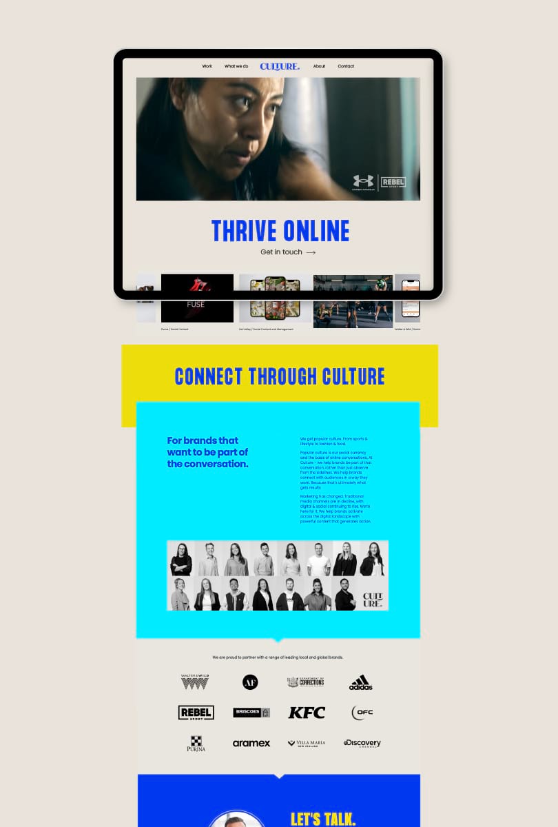 The initial impact of the branding has been very positive: "We have had comments from clients about how good the new brand is. “It looks really clean, really fresh."" Culture has found that the new brand helps to hero their work, and makes it more engaging and consistent. Led with the new branding Culture is now positioned as leaders in the digital and social space - hungry and alternative thinkers - with fresh creative and forward thinking strategy.